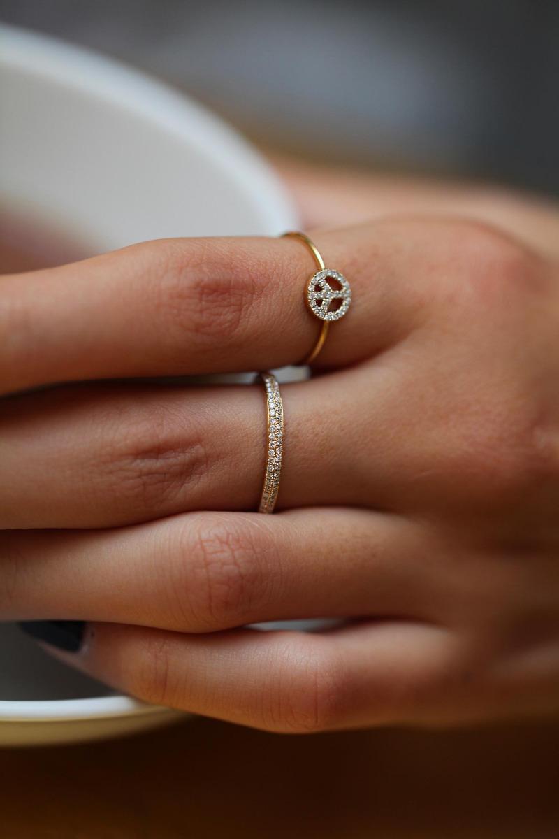 その半分に(0,21カラットの)ダイヤモンドを敷き詰めた、エレガントなゴールドのリング"Amour"。ゴールドは、イエロー、ホワイト、そしてピンクから選ぶことが出来ます。