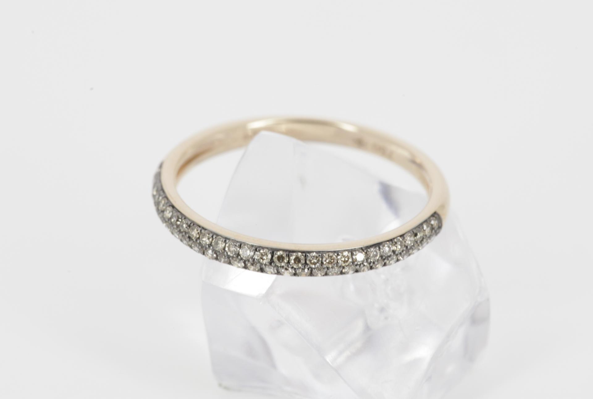 その半分に(0,21カラットの)シャンパンカラーのダイヤモンドを敷き詰めた、洗練されたゴールドのリング"Amour"。ゴールドは、イエロー、ホワイト、そしてピンクから選ぶことが出来ます。