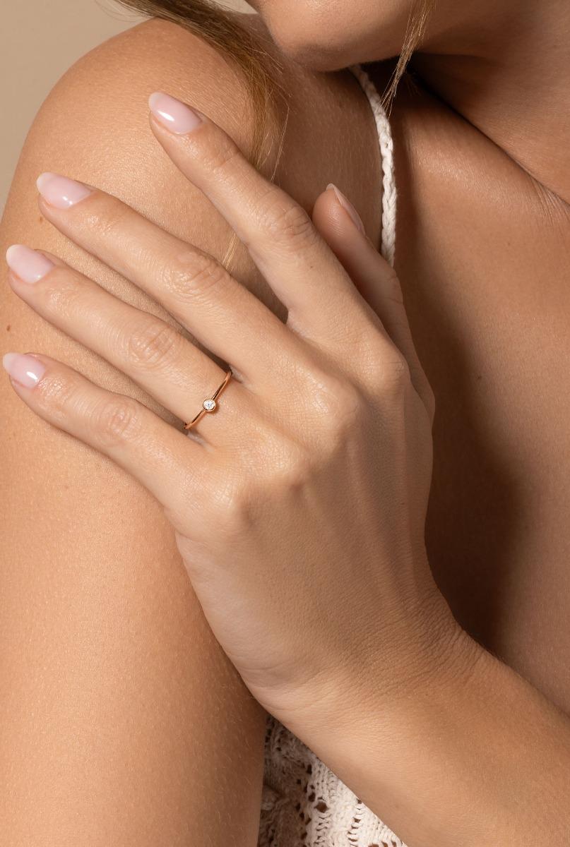 とてもデリケートな・・・クローズドセッティングであしらった0,05カラットのダイヤモンドが、18金の優雅なリングで魅力を放っている、洗練されたデザイン。4色のゴールドから選ぶことが出来ます。