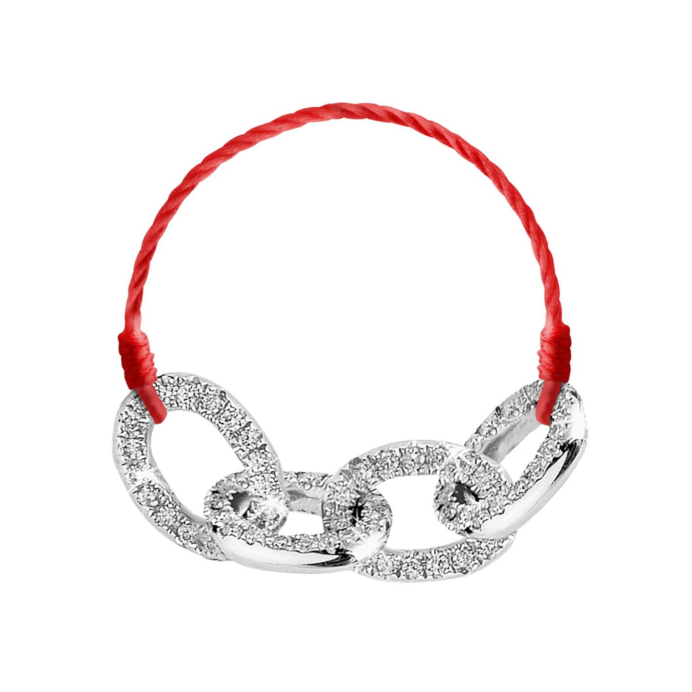 ダイヤモンドの祭典!4つの環に(合計0,18カラットの)ダイヤモンドを敷き詰めて飾り立てた、貴重な糸のリング。チェーンは4色のゴールドから、そして糸は80色から選ぶことが出来ます。