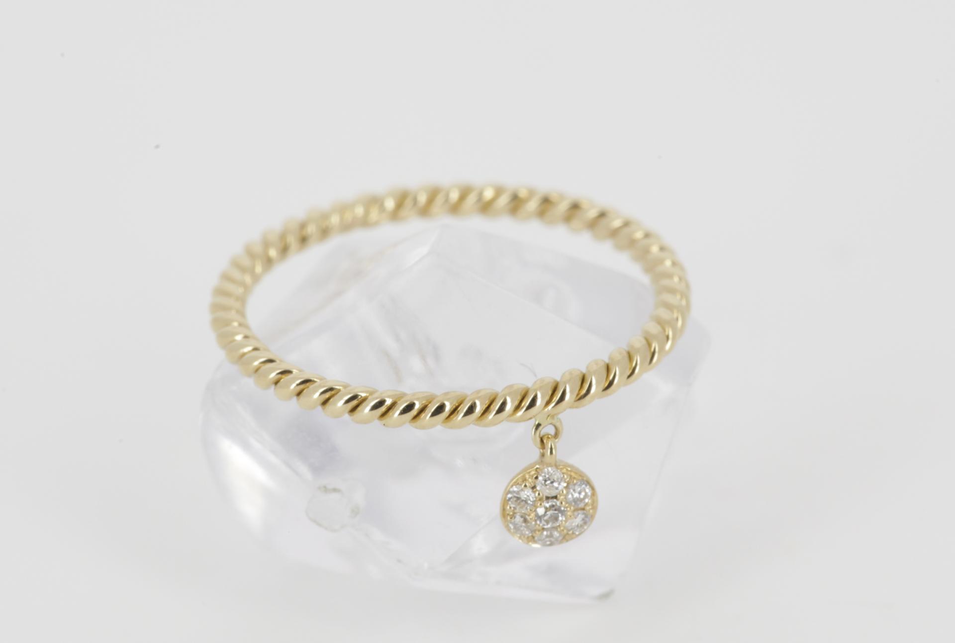 合わせて0,06カラットの、クローズドセッティングであしらった7粒のダイヤモンドを螺旋状のゴールドのリングにぶら下げたリング、"Very Nice"。ゴールドはイエロー、ホワイト、そしてピンクの3色展開です。