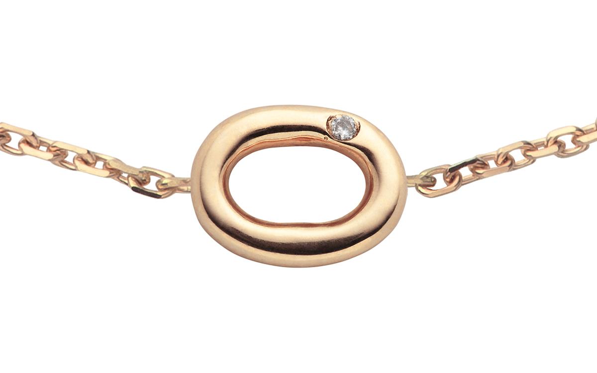 環をとてもシンプルに飾り立てた精巧なブレスレット。留め金は18金、そして3つのリングのアジャスターでサイズを調節できます。チェーンは4色のゴールドから選ぶことが出来ます。