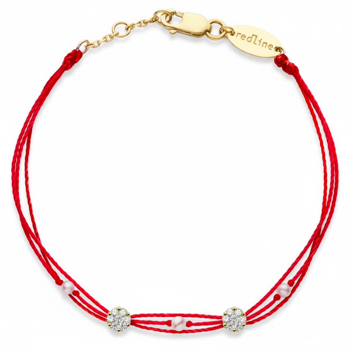 1本、または2本の糸に通したダイヤモンド!コレクションIllusionのダイヤモンドの台座(14粒のダイヤモンドを立て爪で0,1カラットにあしらった)2つを、カラフルな3本の糸の上で柔らかな甘さと輝きを合わせたレッドラインの人気モデルをアレンジするために、3粒のパールと組み合わせました。留め金は18金、そして3つのリングのアジャスターでサイズを調節できます。チェーンは3色のゴールド、そして糸は80色から選ぶことが出来ます。