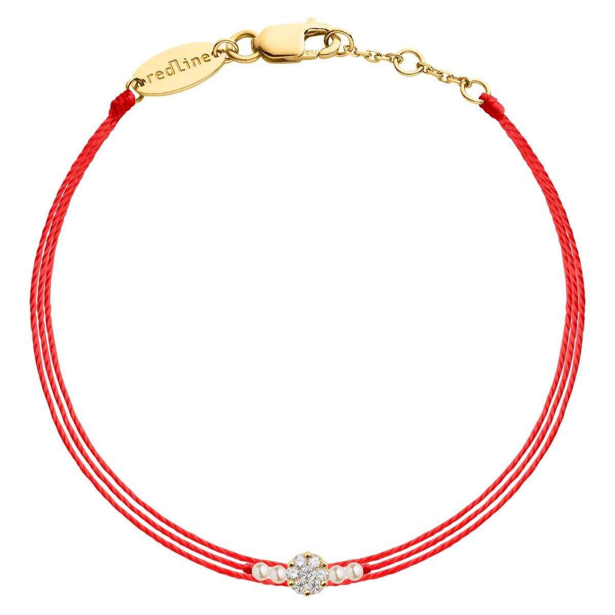 糸に通したダイヤモンド・・・このブレスレットの、0,05カラットにまとめて立て爪であしらった7粒のダイヤモンドの輝きは、まるで1粒の石のよう。両サイドの0,14mmのパールが、レッドラインのベストセラーであるIllusionをアレンジしたこのモデルに甘美さを、そして3本の糸が色鮮やかな効果をもたらしています。留め金は18金、そして3つのリングのアジャスターでサイズを調節できます。チェーンはホワイトゴールドまたはイエローゴルドから、そして糸のカラーは30種類の組み合わせから選ぶことが出来ます。