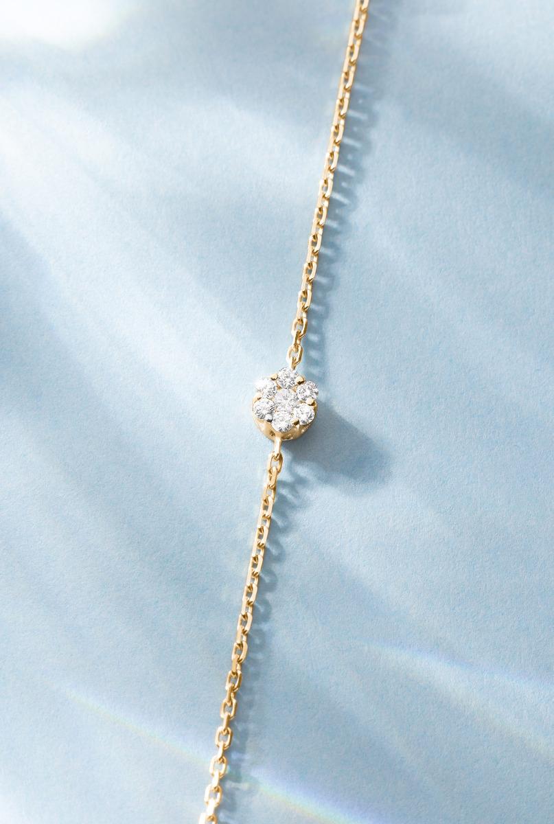 大局的に見ると、いく粒かのダイヤモンドを0,1カラットにまとめて立て爪であしらったこのSo Illusionの輝きは、まるで一粒の石かのよう。ゴールドのチェーンが、シンプルで洗練されたジュエリーを生み出すために、永遠なるダイヤモンドの力強さと調和しています。留め金は18金、そして3つのリングのアジャスターでサイズを調節できます。チェーンはホワイトゴールドまたはイエローゴールドから選ぶことが出来ます。