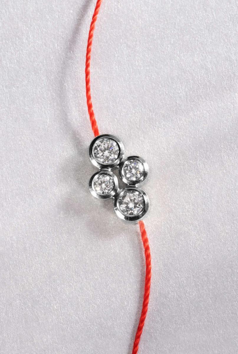 4倍の輝きと光をもたらす、4粒のダイヤモンド。それぞれクローズドセッティングではめ込まれた4粒のダイヤモンド(0,1カラット2粒、0,05カラット2粒)が輝くブレスレット。レッドラインの糸がこの精巧な台座にさらに洗練さをもたらしています。留め金は18金、そして3つのリングのアジャスターでサイズを調節できます。チェーンは4色のゴールドから、そして糸は80色から選ぶことが出来ます。
